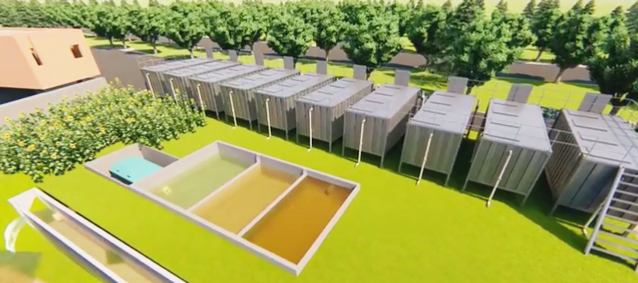 集裝箱式養殖系統采用 20 呎定制化“集裝箱”,尺寸是 6.1 米 *2.4 米 *2.8 米,養殖水體 25 立方米,占地面積為 15 平方米 ,配有納米增氧管(增氧)、出魚口(收魚)、集污槽(排污)、天窗(觀察投喂飼料)、固液分離器(尾水處理)等功能構件。